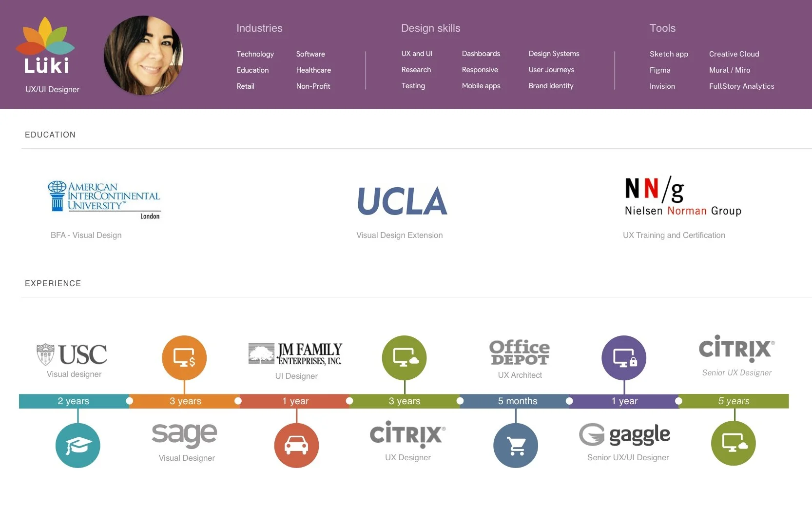 I have 15 years of wide-range UI and UX design work experience, including designing for education at USC, retail at Office Depot, and for tech companies such as Citrix and Sage. I also have non-profit experience at the Arthritis Foundation, Boys and Girls Clubs of America, and Big Brothers Big Sisters. I like giving back and volunteering my creative skills to help improve people's lives. My great passion for branding gave me the opportunity to win design competitions and awards.