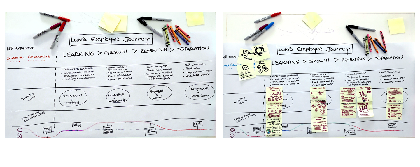 My first step was to explore – review previous user interviews and analyze findings from prior research, so I could understand the employee journey, their challenges and ultimately design the ideal experience for them.
