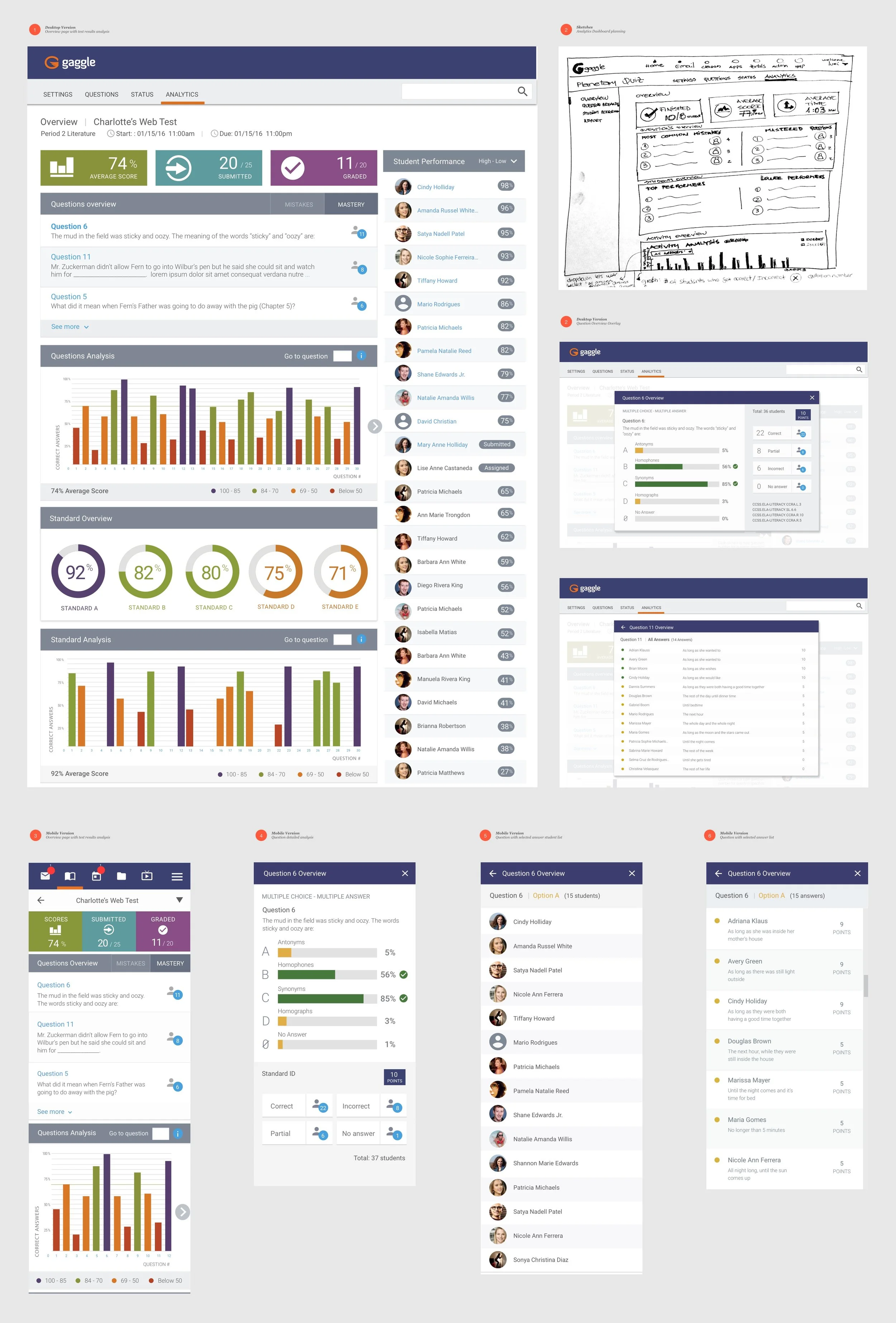 Solution: Designed a dashboard to give instructors data overview and different levels of information on each test. The analytics dashboard provided instructors with immediate results so they could quickly assess, give targeted feedback to their students, tailor their lessons, and act proactively to each student's needs.