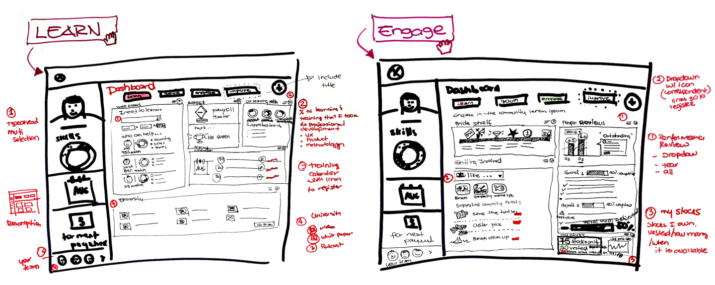 I turned the ideas into dashboard "widgets" and started sketching the "Learn" and “Engage” experience....