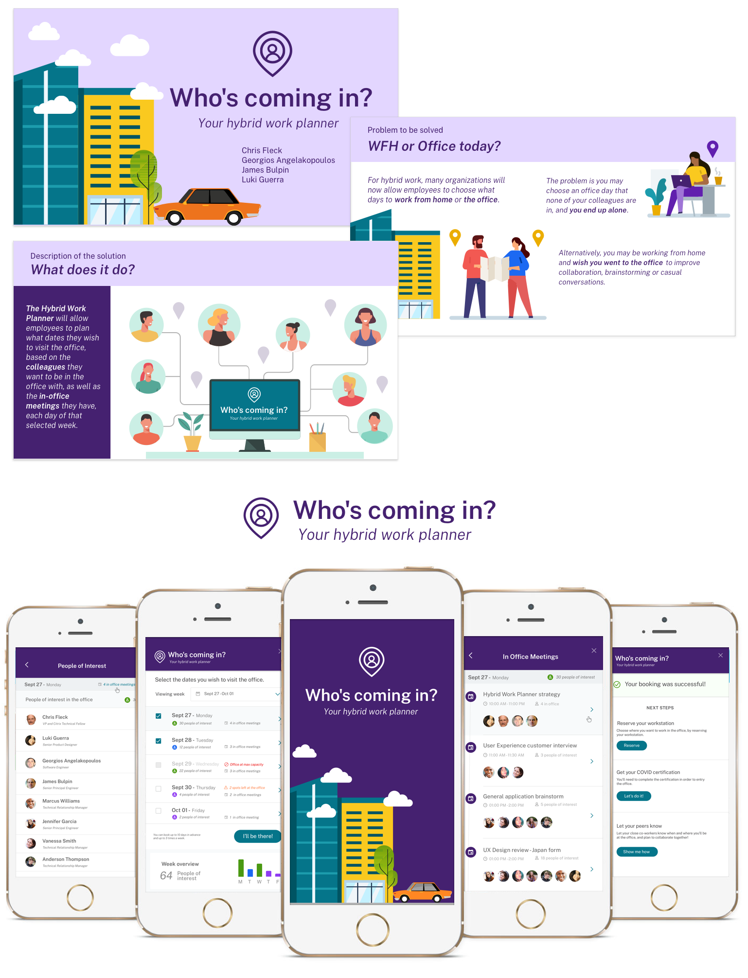 Solution: The app would allow Citrix employees to plan what dates they wish to visit the office, based on the colleagues they want to be in the office with, as well as the in-office meetings they have each day of the week.