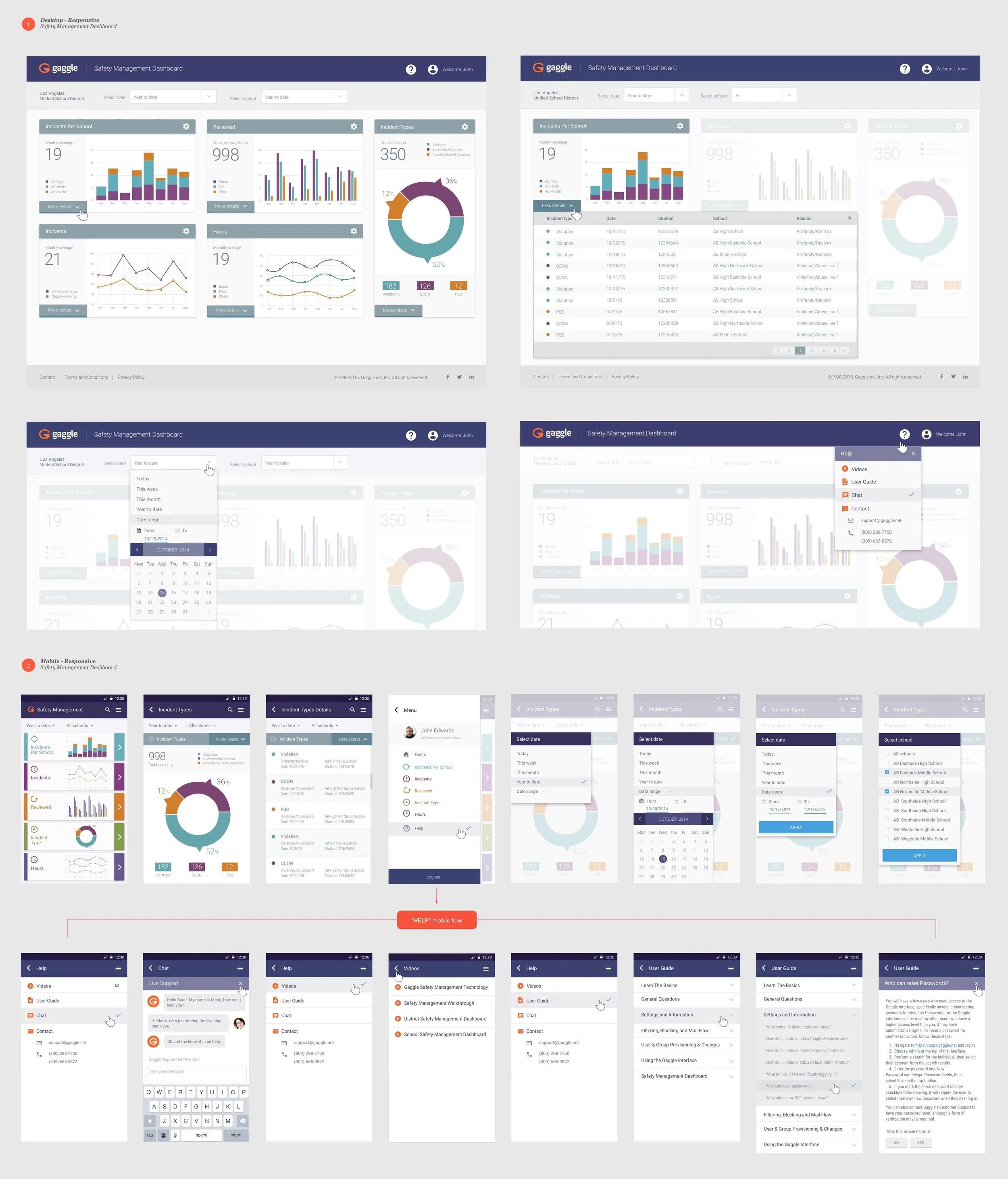My role: Creating the user experience and interface design for the Student Safety Management Dashboard. I lead every step of the design process, doing research, competitive analysis, interviewing users and content review team, prototyping, refining into wireframes, and turning them into high definition mockups.